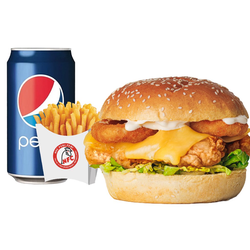 Chicken Breast Fillet Burger with a Hashbrown & Cheese, Fries Can Of Drink Or Any Small Side