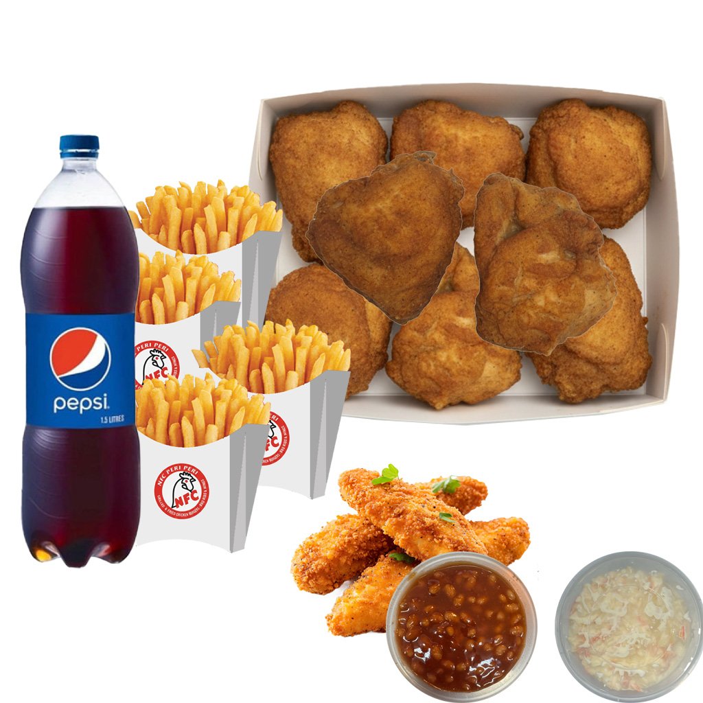 8 Pcs Chicken, 8 Boneless Chicken, 4 Regular Fries, Beans, Coleslaw, 1.5L Bottled Drink